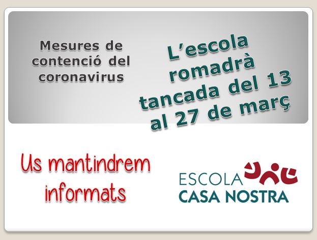 Seguirem atents a les instruccions dels Departament de Salut i d’Educació, i a l’evolució de la situació. Si teniu algun dubte podeu adreçar-vos a l’escola a través del correu casanostra@escolacasanostra.